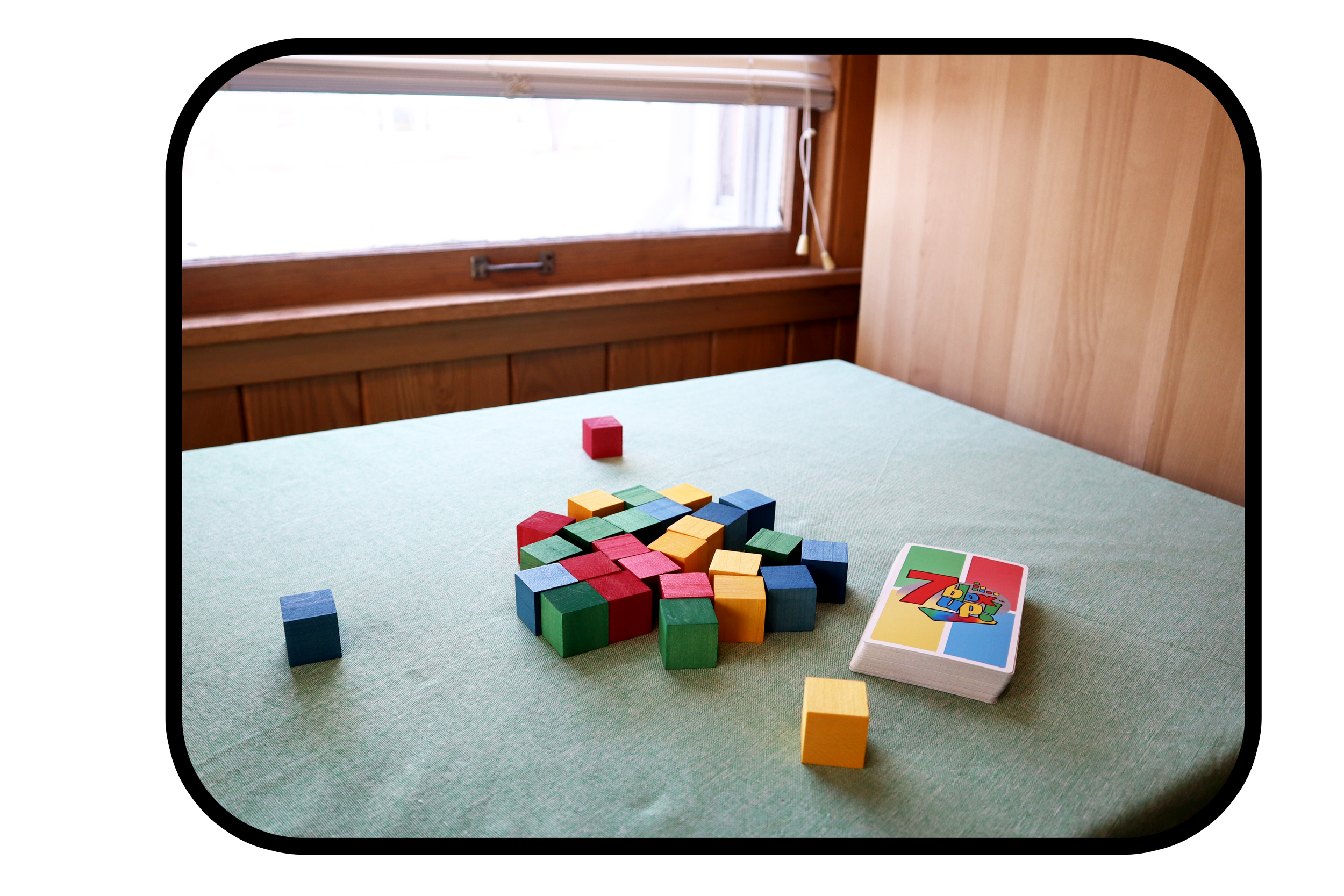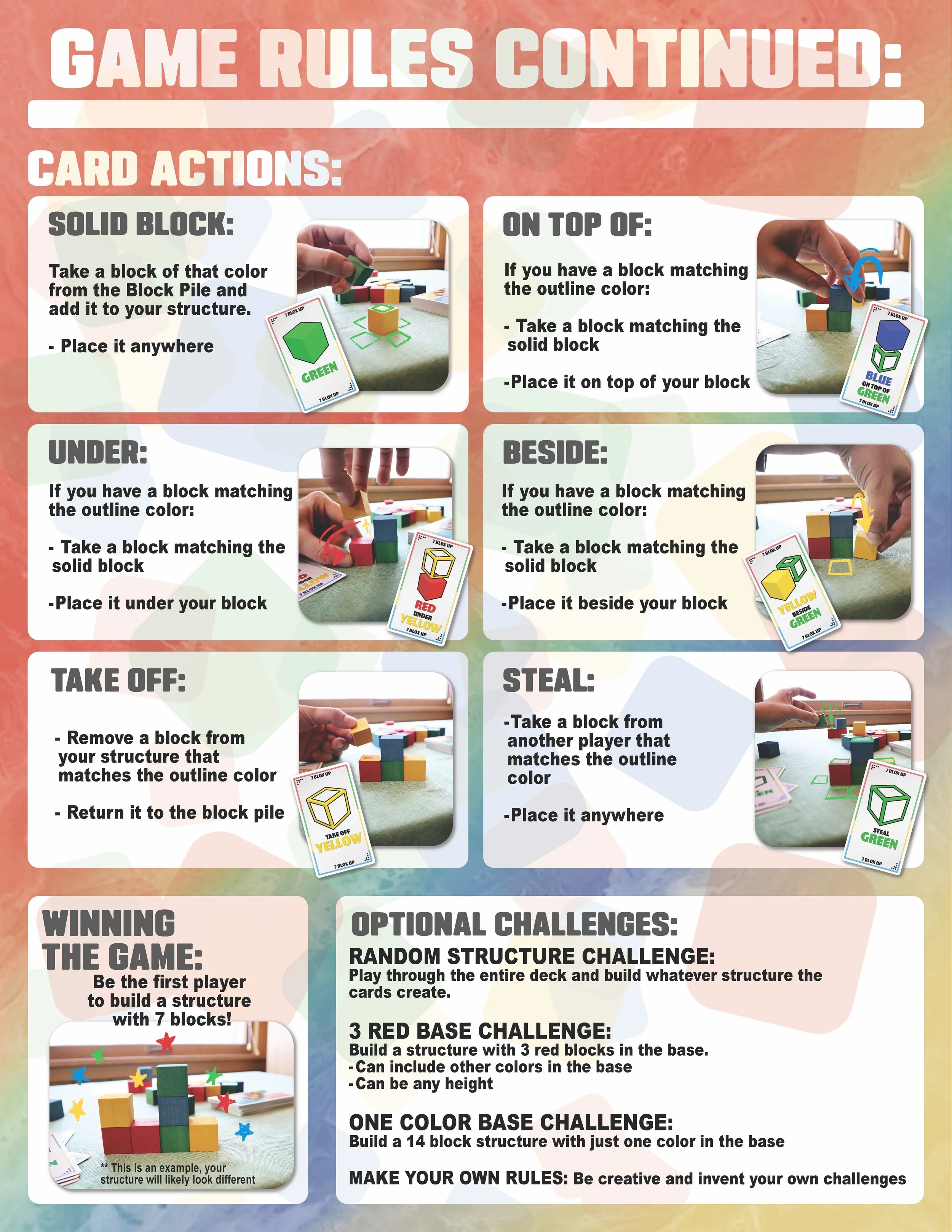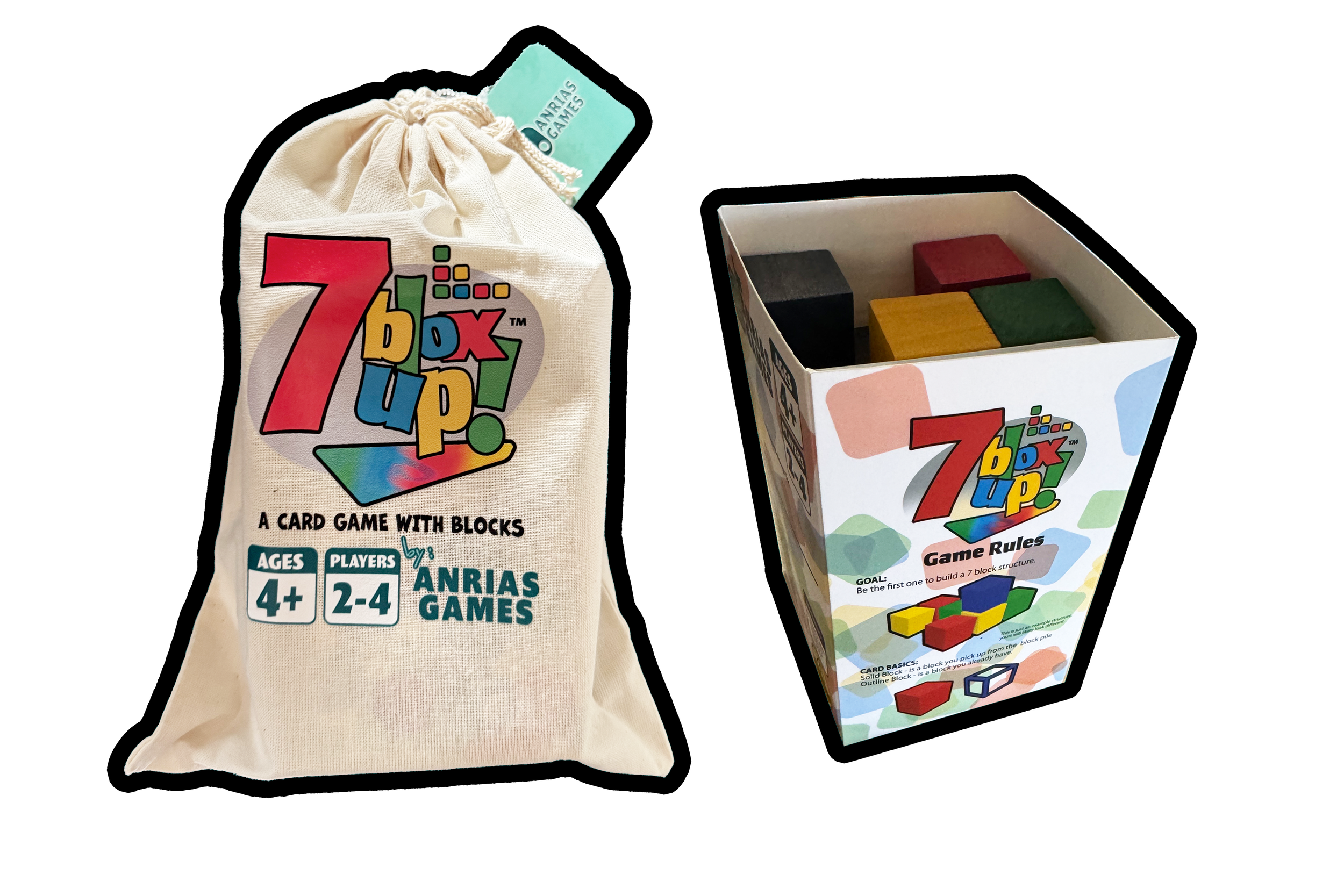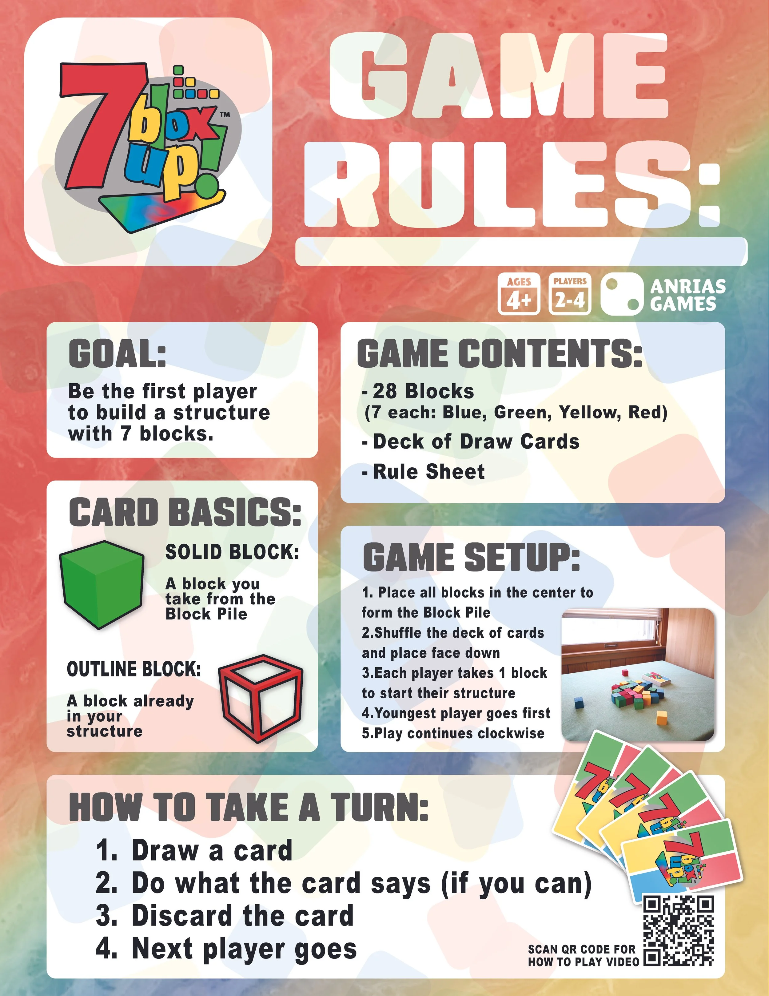 7 Blox Up is a family friendly game for ages 4 and up for two to six players. Be the first player to build a structure with seven blocks based on what the cards tell you. Each player chooses one block to start with, then takes turns drawing a card from the deck to continue building. Follow what the card says if you are able, if you don’t have the blocks necessary discard and move on to the next player.